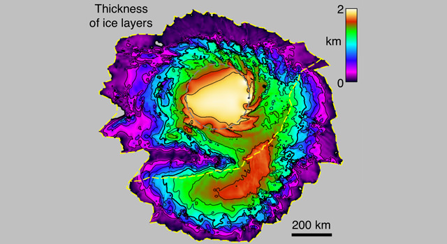 Alignment of the layering patterns with the modeled climate cycles provides insight about how the layers accumulated. These ice-rich, layered deposits cover an area one-third larger than Texas and form a stack up to 2 kilometers (1.2 miles) thick atop a basal deposit with additional ice.