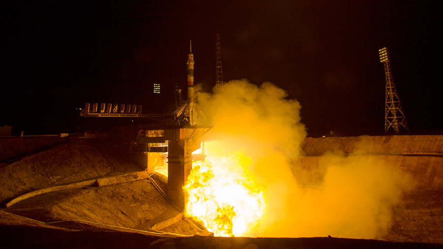 The Soyuz TMA-20M rocket launches from the Baikonur Cosmodrome in Kazakhstan on Saturday, March 19, 2016 carrying Expedition 47 Soyuz Commander Alexey Ovchinin of Roscosmos, Flight Engineer Jeff Williams of NASA, and Flight Engineer Oleg Skripochka of Roscosmos into orbit to begin their five and a half month mission on the International Space Station. (Photo Credit: NASA/Aubrey Gemignani)[/caption]