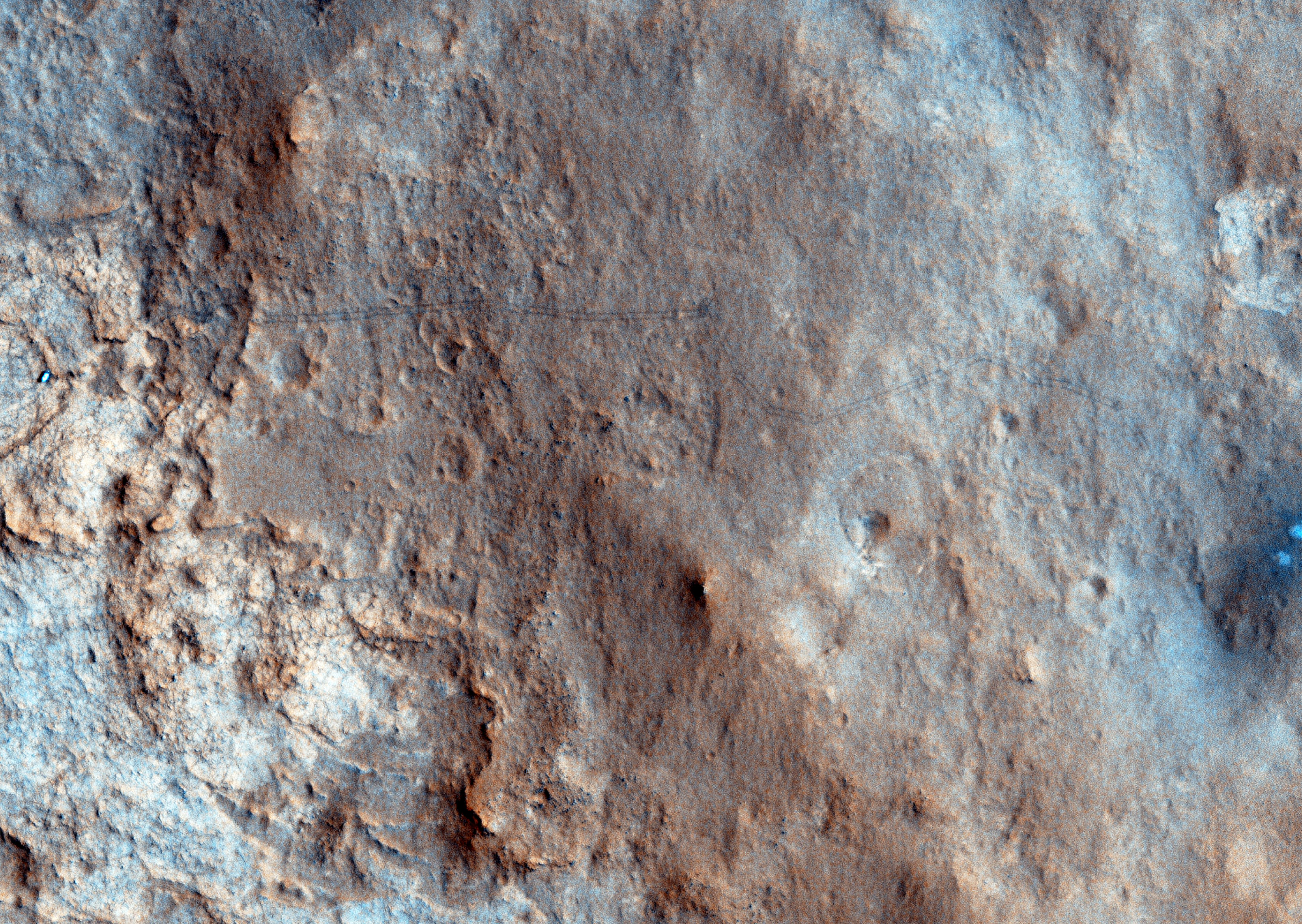 As Curiosity prepares for the historic first drilling operation on Mars, the HiRISE camera aboard the Mars Reconnaissance Orbiter captured an image of it from 271 km (169 miles) up, along with twin lines of tracks and the blast marks from the dramatic rocket-powered descent back on August 6 (UTC).