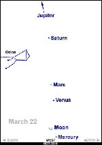 To catch the planetary get-together, you'll need a good view of the sky, free of buildings and bright city lights (you should still be able to see the planets through urban light pollution). The show begins around March 22 and lasts through early April, when Mercury fades from sight. The finest views will take place during the last 8 to 10 days of March.