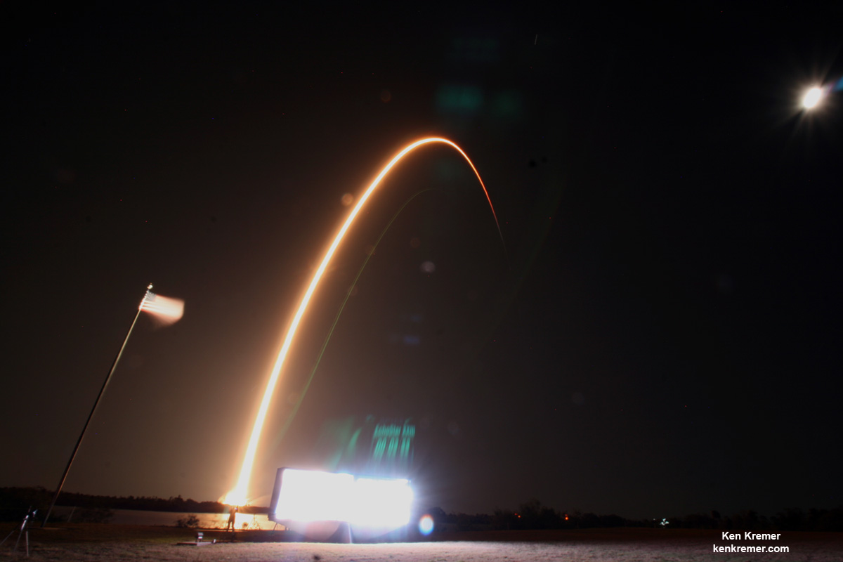 The post midnight spectacle thrilled spectators who braved the wee hours this morning and were richly rewarded with a rousing rush as the 229 foot tall Falcon 9 rocket thundered to life at 2:00 a.m. EDT Thursday, March 16 from historic Launch Complex 39A on NASA's Kennedy Space Center and sped to orbit.