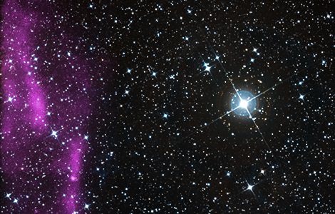 G266.2-1.2 in X-ray (purple) and optical light. Chandra spotted high-energy particles shooting out from this supernova leftover. The optical data comes from the Digitized Sky Survey and is available in red, green, and blue. Credit: X-ray: NASA/CXC/Morehead State Univ/T.Pannuti et al, Optical: DSS[/caption]