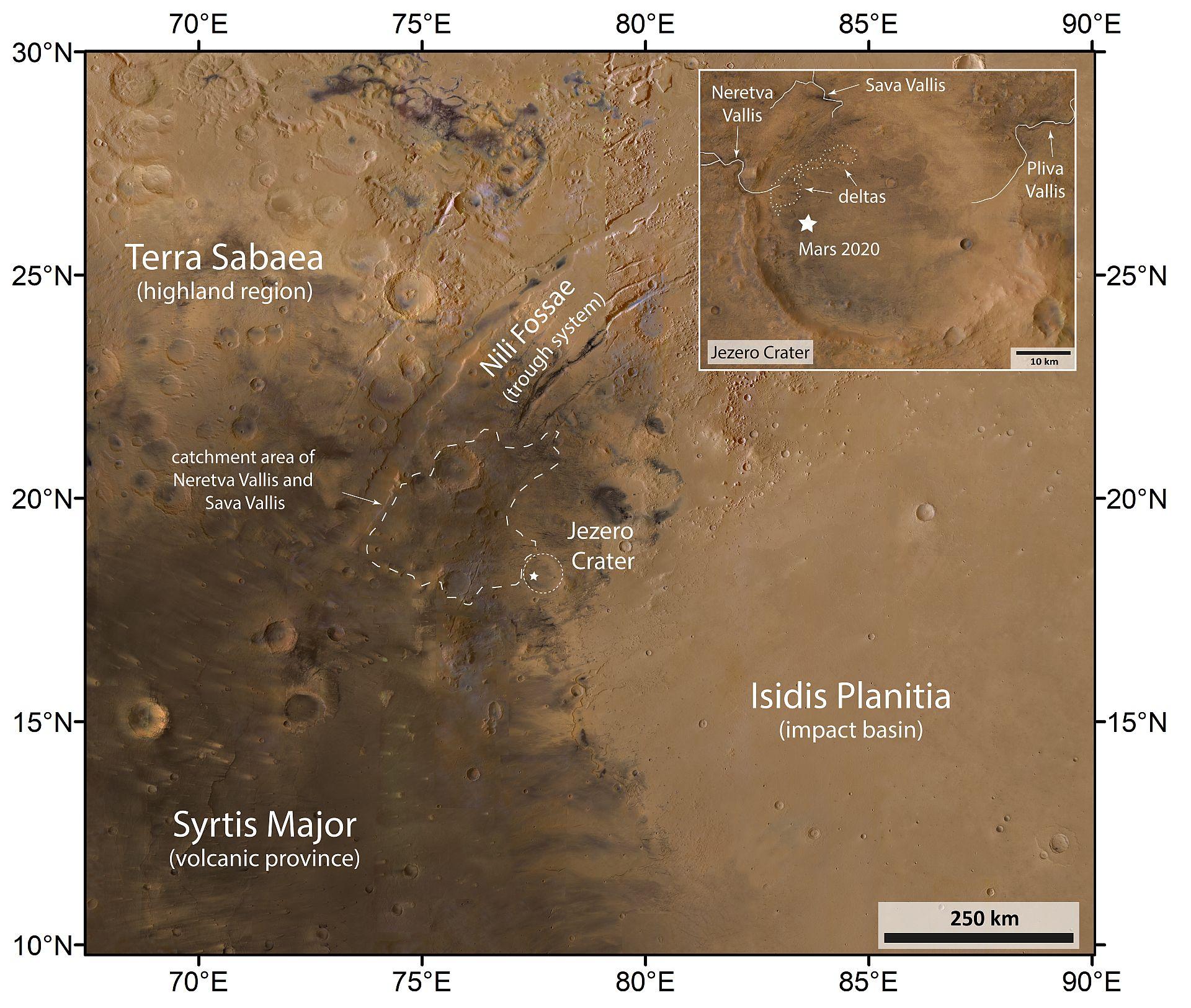Or are these features created by ancient volcanism? Jezero sits next to an intriguing system of faults known as Nili Fossae and a prominent area of volcanism named Syrtis Major, where lava flowed some three billion years ago.
