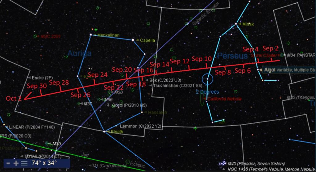 The September apparition sees the comet traveling from the constellation of Perseus the Hero into Auriga the Charioteer. This places the comet well in the late evening sky for northern hemisphere observers. Some photogenic dates with destiny include a 0.5 a degree (the diameter of a Full Moon) pass near the +7thmagnitude open star cluster NGC 1857 on September 20th, and close passes near the familiar open star clusters Messier 38 and Messier 37 during the week of September 21stthrough the 26th.