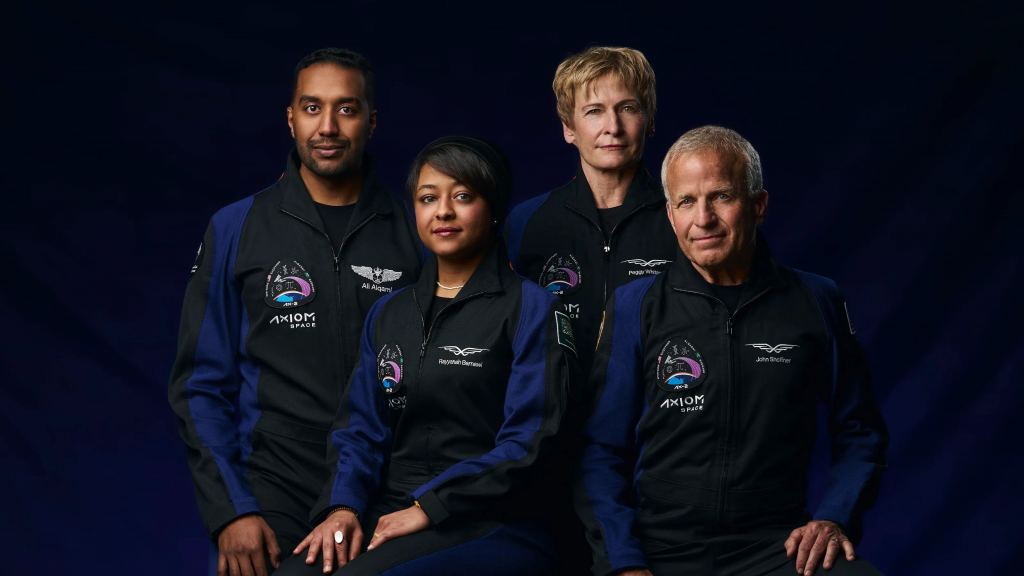 Commander (and former NASA astronaut) Peggy Whitson, pilot and businessman John Shoffner, and Mission Specialists Ali Alqarni -- a captain in the Royal Saudi Air Force -- and Rayyanah Barnawi, a biomedical researcher, will do scientific research, public outreach, and other commercial activities for their stay in space.
