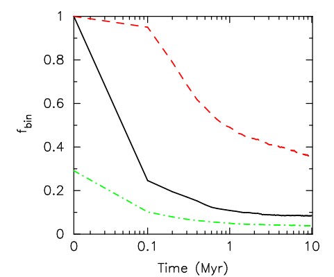 This figure from the research shows the simulation results. The lines are for objects below the hydrogen-burning mass limit, meaning no stellar-mass objects. The y-axis shows the initial binary fraction of low-mass objects. The solid black line shows how the binary fraction evolved in dense simulations. The red dashed line shows how the binary fraction evolved in lower-density simulations. The green dashed line shows how the binary fraction evolved in a simulation that included brown dwarfs, which drew their masses from the initial binary fraction. The planet-planet separations in all these simulations come from the JuMBOs in the ONC. Image Credit: Parker et al. 2025, MNRAS.