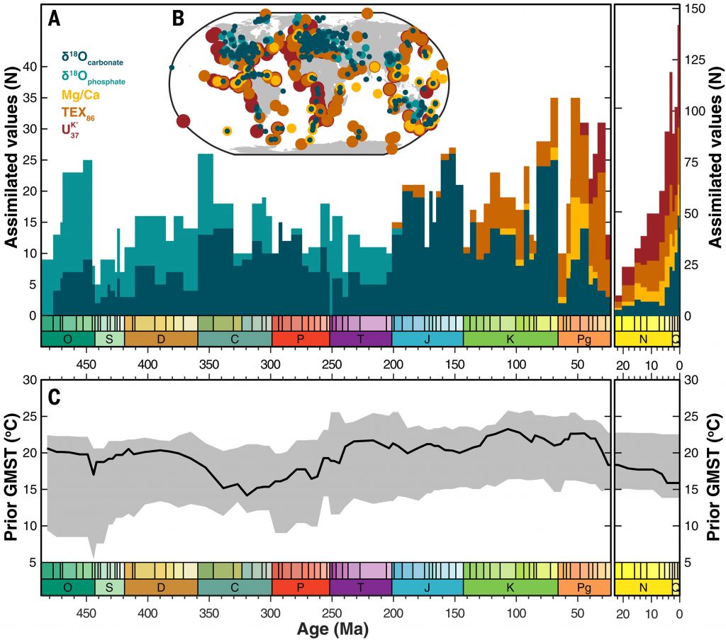 The new historical temperature comes from an effort named PhanDA, which stands for Phanerozoic Data Assimilation. PhanDA combined data from climate models with data from geology to determine how the climate has changed over the last nearly 500 million years. The Phanerozoic is Earth's current geological eon, and it started 538.8 million years ago. It's known for the proliferation of life, and its beginning is marked by the appearance of the hard shells of animals in the fossil record.