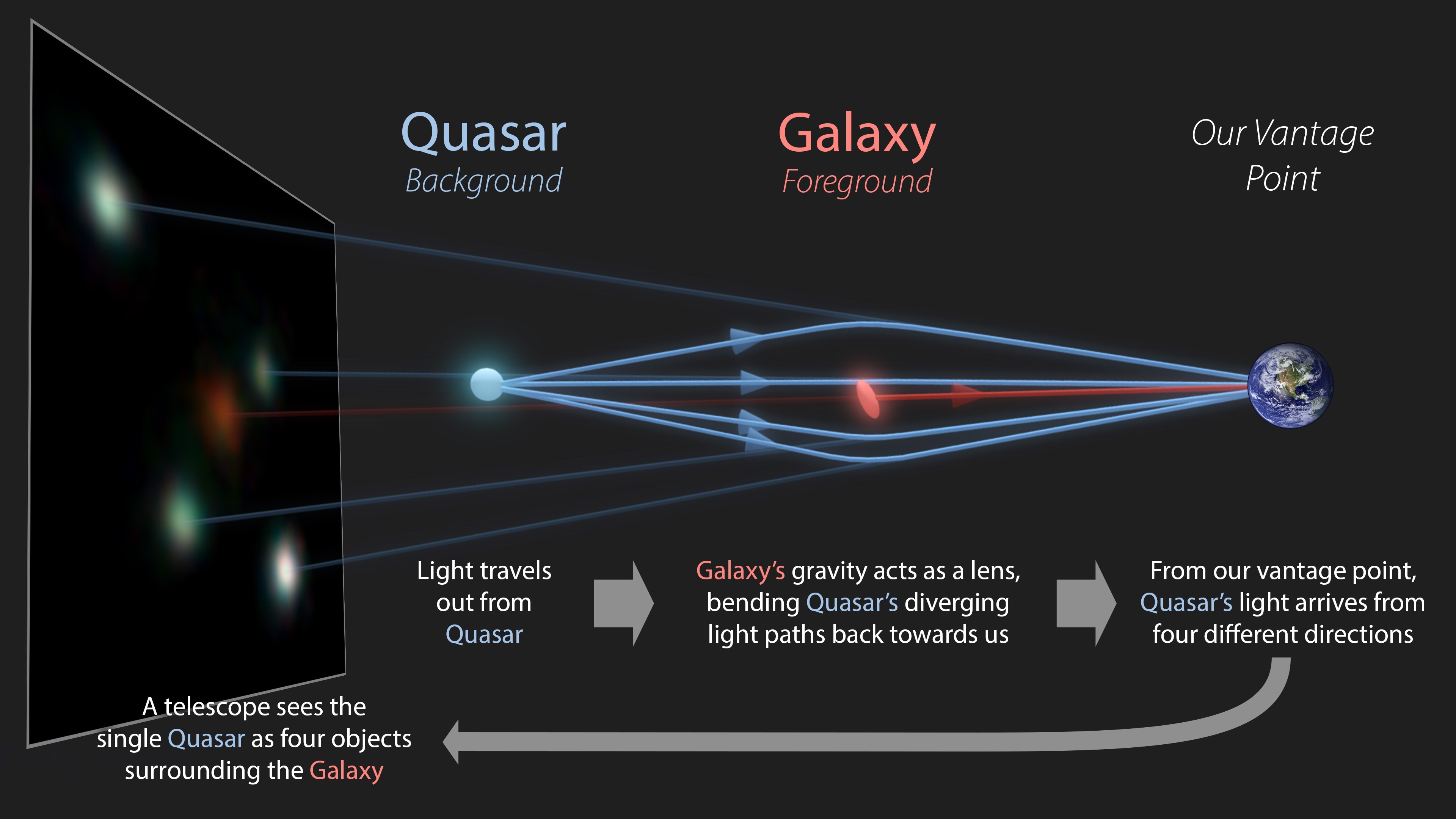 "Quasars are intrinsically variable objects, and because the light in each lensed image has crossed different paths in the Universe, fluctuations in the quasar's light show up in the images at different times. From this it is possible to estimate the Hubble-Lemaître constant*." "Based on general relativity and the distribution of matter in the galaxy, we can predict where the images of the lensed quasar should be. The difference between what we predict and what we observe, tells us something about the properties of different dark matter models."*
