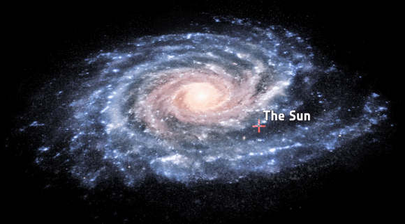 Fortunately, we're far away from the spiral arms, and we orbit the center of the Milky Way in a nice circular orbit, which means we don't cross these spiral arms very often.