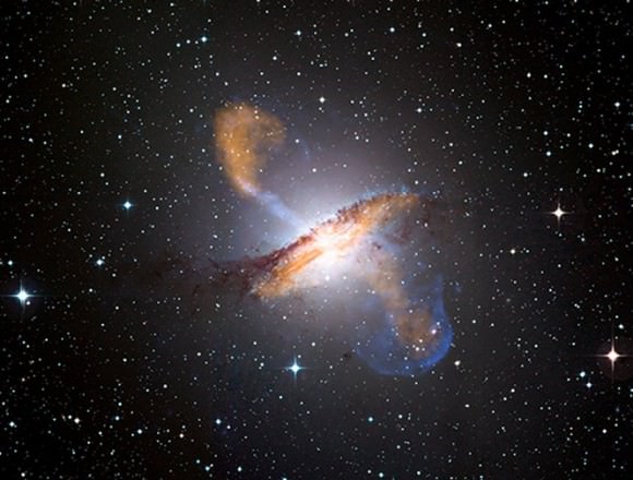 Here's a picture of the galaxy Centaurus A, located in the constellation of the same name. The huge sprays of material above and below the galaxy demonstrate the power of the supermassive black hole located at the heart of the galaxy. The jets of material extend more than 13,000 light-years away from the center of the galaxy.