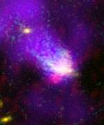 Keel and colleagues are laying out the "forensic evidence" of the galaxy's late life, in a series of presentations today in Atlanta, Ga., at the 203rd meeting of the American Astronomical Society. Astronomers have assembled the evidence by combining a variety of diagnostic observations from telescopes analyzing the galaxy's appearance in X-ray, optical, and radio light. Parallel observations at different wavelengths trace how stars, gas, and dust are being tossed around and torn from the fragile galaxy, called C153. Though such "distressed" galaxies have been seen before, this one's demise is unusually swift and violent. The galaxy belongs to a cluster of galaxies that slammed into another cluster about 100 million years ago. This galaxy took the brunt of the beating as it fell along a trajectory straight through the dense core of the colliding cluster.