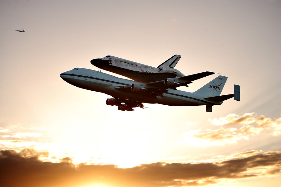 [caption id="attachment_94647" align="aligncenter" width="580" caption="A T-38 aircraft escorts Discovery atop the Shuttle Carrier Aircraft. Credit: Jen Scheer. "]