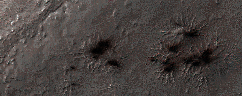 On Aug. 20, 2014, Martian dust mounds are on top of the araneiforms in 'Inca City', as well as dark areas on the terrain showing where the ice cap in the southern hemisphere burst and sent gas and dust into the surroundings. Fans in the area are pointing in multiple directions, showing how the wind has changed. Image taken by the Mars Reconnaissance Orbiter's HiRISE camera. Credit: NASA/JPL/University of Arizona[/caption]