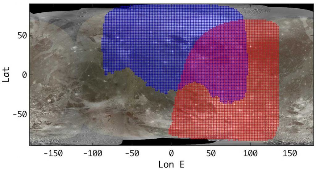 “We found Ganymede’s high latitudes dominated by water ice, with fine grain size, which is the result of the intense bombardment of charged particles. Conversely, low latitudes are shielded by the moon’s magnetic field and contain more of its original chemical composition, most notably of non-water-ice constituents such as salts and organics. It is extremely important to characterize the unique properties of these icy regions to better understand the space-weathering processes that the surface undergoes.”