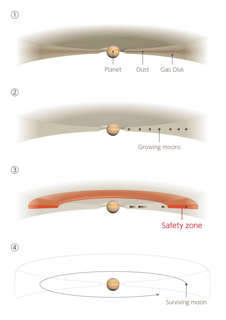 It is from this point onward that many of the satellites draw closer to the planet in their orbits and eventually fall into it. Meanwhile, a large satellite with an orbit in a "safety zone" is able to maintain its distance from the planet. In the fourth and final stage, the gas in the disk dissipates and the satellite that survives in the "safety zone" remains in a stable orbit.