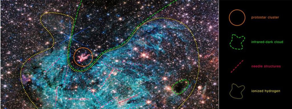 There is one previously unknown enormous protostar, found at the heart of this young cluster. It is over 30 times the mass of our Sun. The astronomers say that the cloud the protostars are emerging from is so dense that the light from stars behind it cannot reach the telescope, making it appear less crowded when in fact it is one of the most densely packed areas of the image. Smaller infrared-dark clouds dot the image, looking like holes in the starfield. That's where future stars are forming.