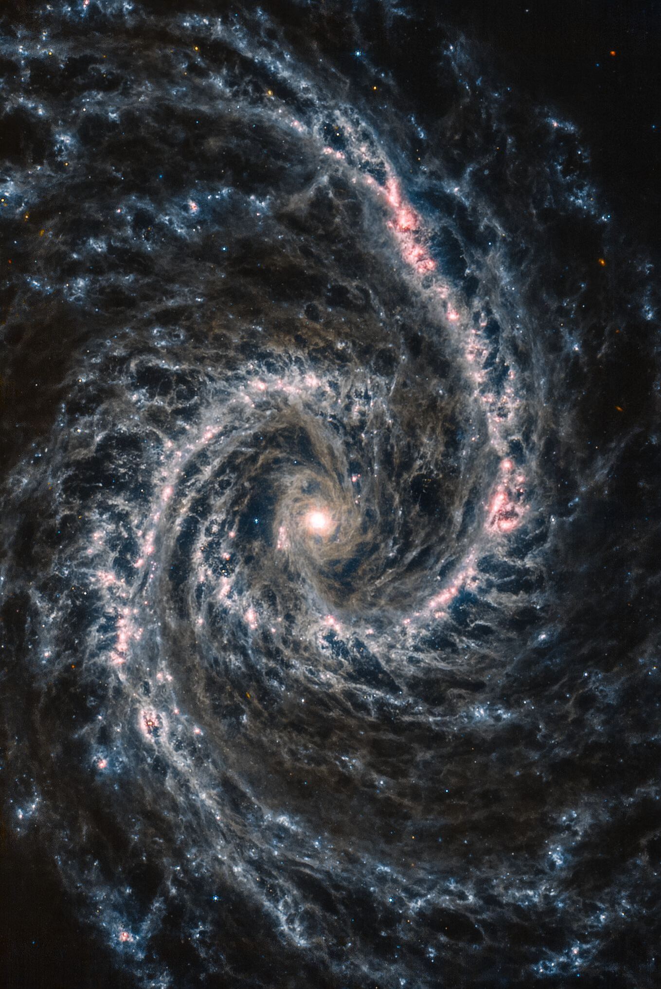Here's an absolutely stunning new view from the James Webb Space Telescope of a dusty spiral galaxy, NGC 1566. Amateur (but expert!) image editor Judy Schmidt took the raw data from JWST's Mid-Infrared Instrument (MIRI) and teased out this eerie, spider-web-like view of this distant galaxy. The swirling and symmetrical arms are so full of dust that not many stars are visible.