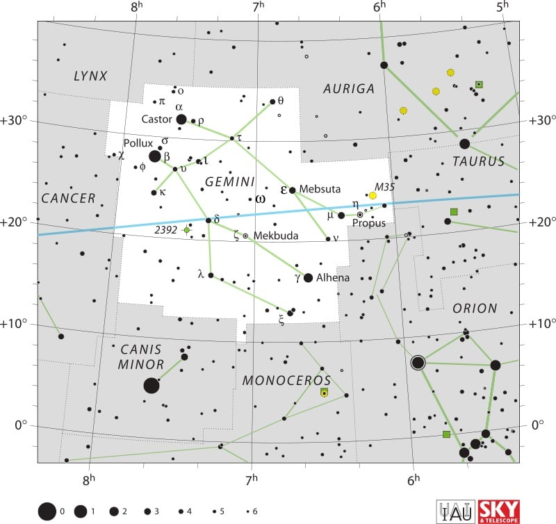 Gemini is bordered by the constellations of Lynx, Auriga, Taurus, Orion, Monoceros, Canis Minor, and Cancer. It can be viewed by all observers located at latitudes between +90° and -60° and is best seen at culmination during February. It covers approximately 54 square degrees of sky and contains 17 main stars in the asterism, with 80 stars possessing Bayer/Flamsteed designations. For binocular observers, Gemini has a wealth of treasures. But to find things, you've got to know your way around!