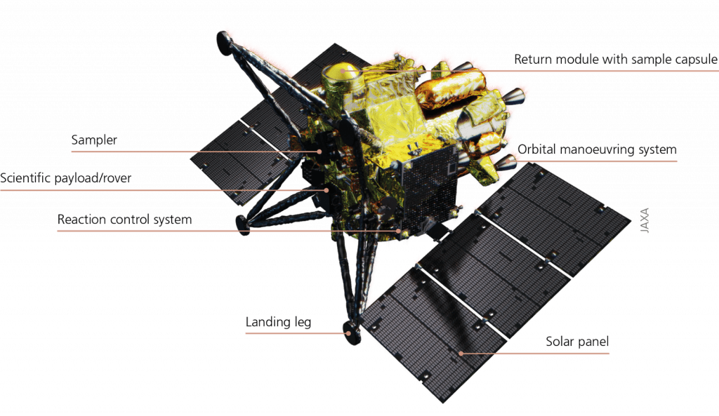 The MMX spacecraft consists of three modules: the propulsion, the exploration, and the sample return capsule. The exploration module has landing legs and a suite of instruments (including samplers) and will carry the IDEFIX rover on board. The exploration module and sample return capsule are connected to the propulsion module, where the thrusters and propellant tanks are located. The MMX design has been completed, and the project team has commenced with the spacecraft's final manufacture, testing, and integration.