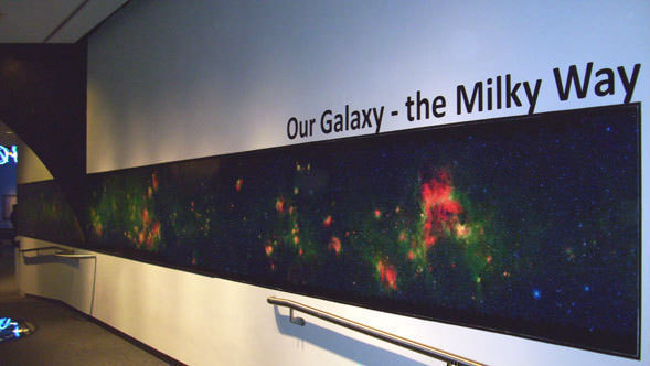 big. The world's largest image of our Milky Way galaxy went on display today at the Adler Planetarium in Chicago. The image spans an area of 37 meters (120 feet) long by 1 meter (3 feet) wide at its sides, bulging to 2 meters (6 feet) to show the center of our humongous galaxy. The panorama represents 800,000 separate images taken by the Spitzer Space Telescope over a five-year period.