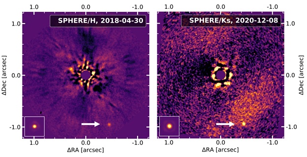 Direct image of the planet YSES 2b (bottom right) and its start, which is being blocked by a coronagraph in the center of the image.