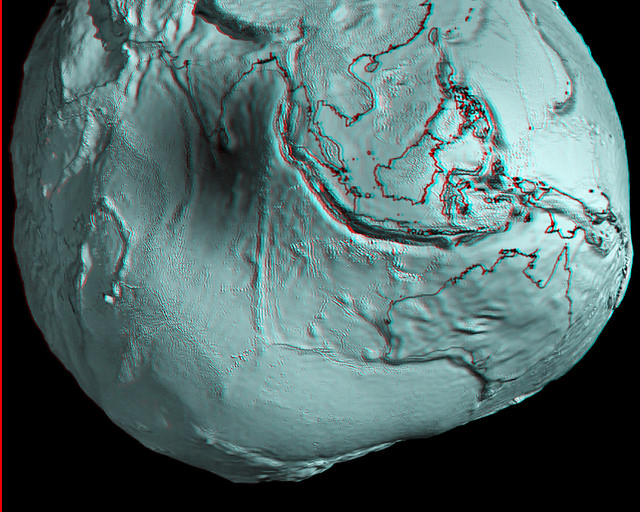 Gravity Field and Steady-State Ocean Circulation Explorer), we showed the entire globe and how it looks like a spinning potato. Nathanial's anaglyphs show close-ups of various parts of the globe. Above is Australia and Asia. Take a trip around the GOCE geoid 3-D world below. Remember, use the red/cyan 3-D glasses to get the full effect!