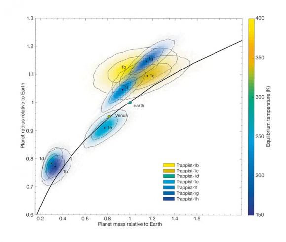 This diagram compares the sizes, masses and estimated temperatures of the TRAPPIST-1 planets with Solar System planets. The colours indicate temperatures and the black line matches the densities and composition of the terrestrial planets in the Solar System. Planets above the line are less dense and planets below are more dense. Image: EXO/S.Grimm et. al.[/caption]
