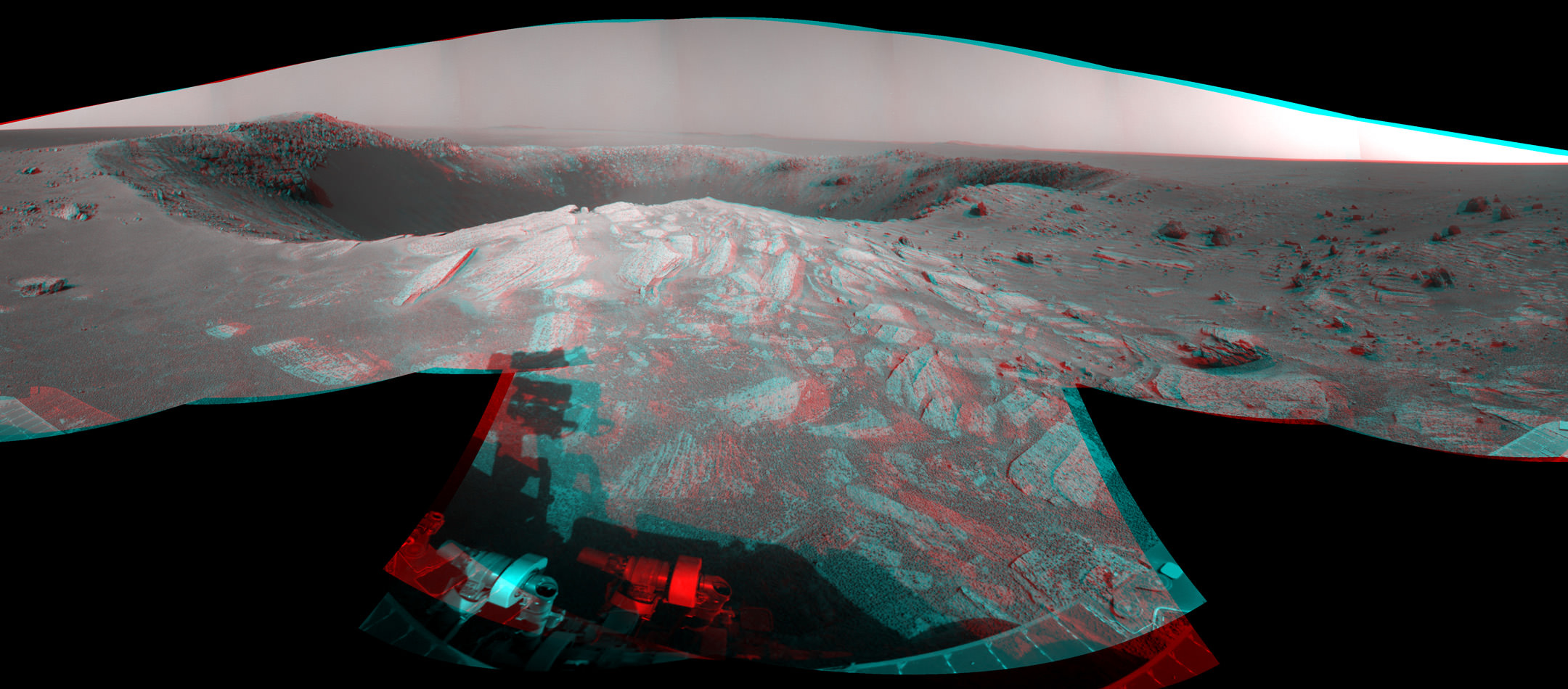 While sitting just five meters from the rim on Dec. 16, Opportunity imaged the football field sized crater - some 90 m wide - with both its left and right eye navigation cameras. A mosaic of these images was stitched together by NASA to create a stunning 360 degree stereo panoramic vista. The images are snapped from the same height seen by an adult to give the perspective that a human eye would see when standing "On Mars".