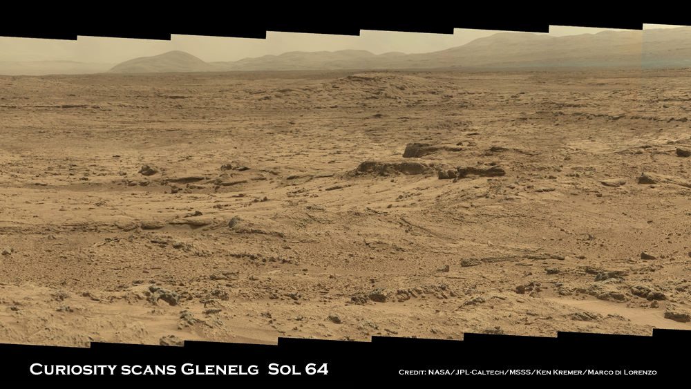Image Caption: Panoramic mosaic shows gorgeous Glenelg snapped by Curiosity on Sol 64 (Oct. 10) with eroded crater rim and base of Mount Sharp in the distance. This is a cropped version of the full mosaic as assembled from 75 images acquired by the Mastcam 100 camera. See full mosaic below. Credit: NASA/JPL-Caltech/MSSS/Ken Kremer/Marco Di Lorenzo