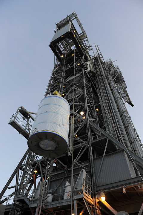 [caption id="attachment_88301" align="alignleft" width="385" caption="Crane lifts GRAIL A & B to the top of the Mobile Service Tower on Aug. 18. The probes are wrapped in protective plastic sheeting inside the handling can. Credit: NASA/Kim Shiflett"]