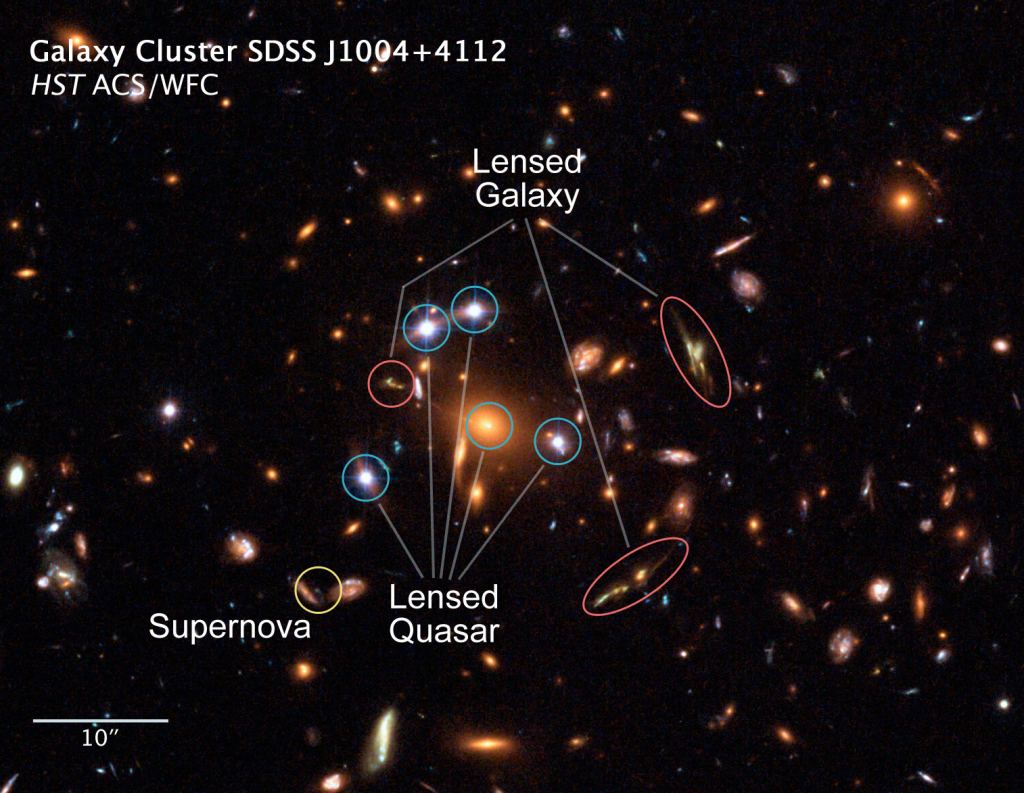 The Sloan Digital Sky Survey first discovered cluster SDSS J1004+4112. Hubble Space Telescope imaged it in 2006. It was the first image of a single quasar with its light split into five images by lensing.