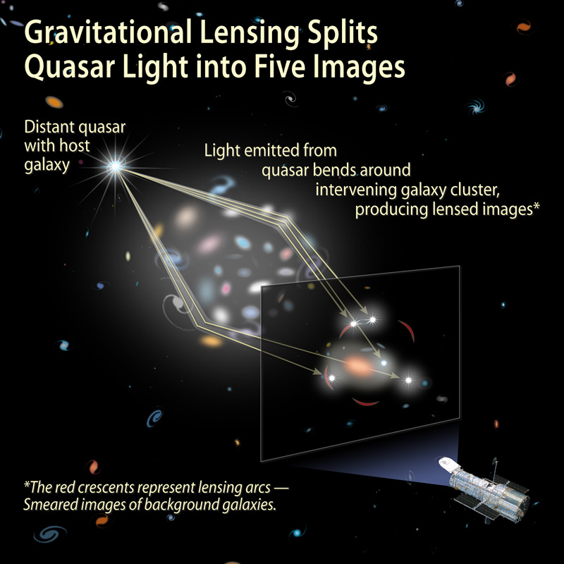 Way back in 1979, astronomers spotted two nearly identical quasars that seemed close to each other in the sky. These so-called "Twin Quasars" are actually separate images of the same object. Even more intriguing: the light paths that created each image traveled through different parts of the cluster. One path took a little longer than the other. That meant a flicker in one image of the quasar occurred 14 months later in the other. The reason? The cluster's mass distribution formed a lens that distorted the light and drastically affected the two paths.