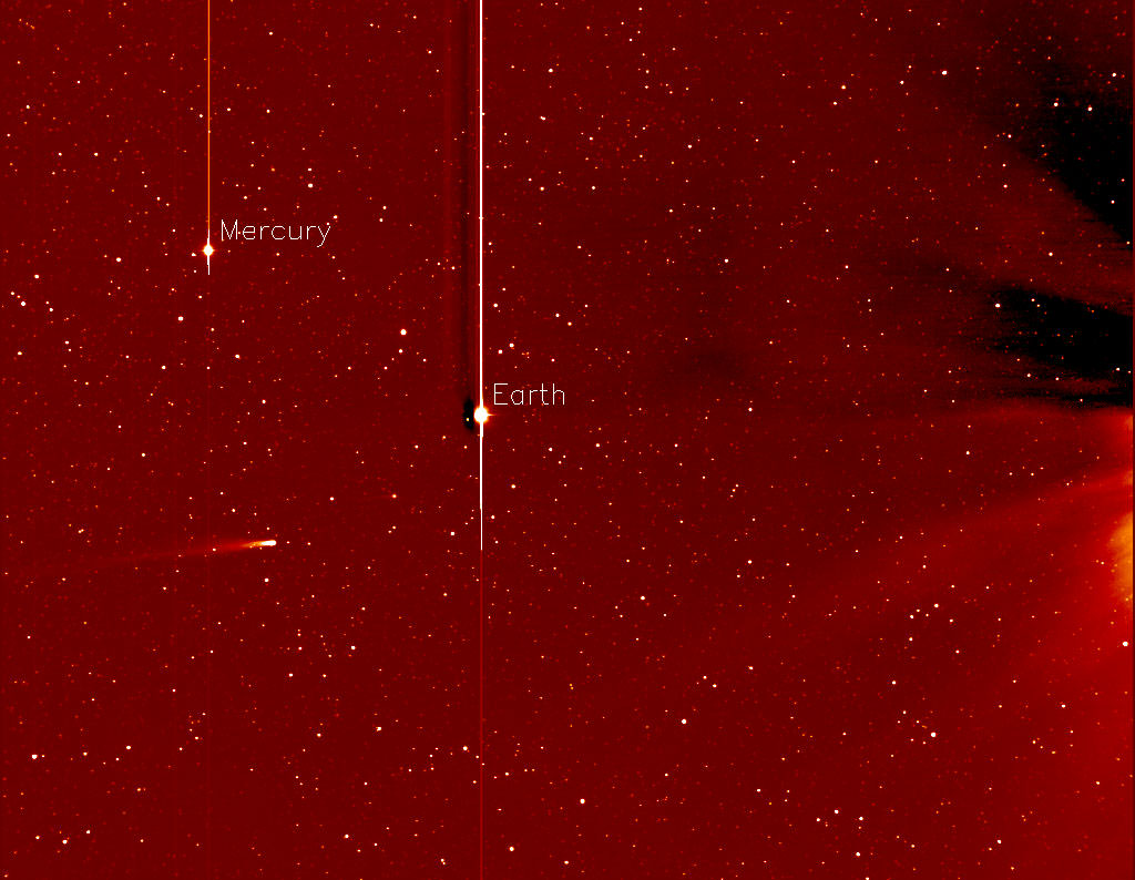 Comet ISON will be under constant view Nov. 27-30 in the SOHO coronagraph, an instrument that blocks the sun so scientists can study the near-solar environment. Click to see images. Credit: NASA/ESA[/caption]