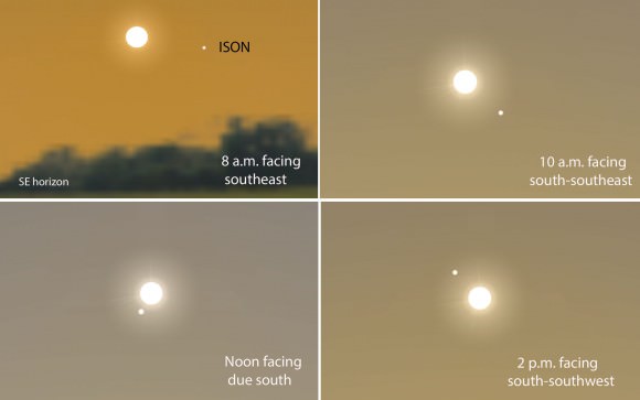 Use these little pictures to help you know what direction from the sun to look for Comet ISON between 8 a.m. and 2 p.m. CST Thursday Nov. 28. Add one hour for Eastern time; subtract 1 hour for Mountain and 2 hours for Pacific. Be sure to face the direction shown when using the diagrams and completely block the sun from view. Stellarium[/caption]