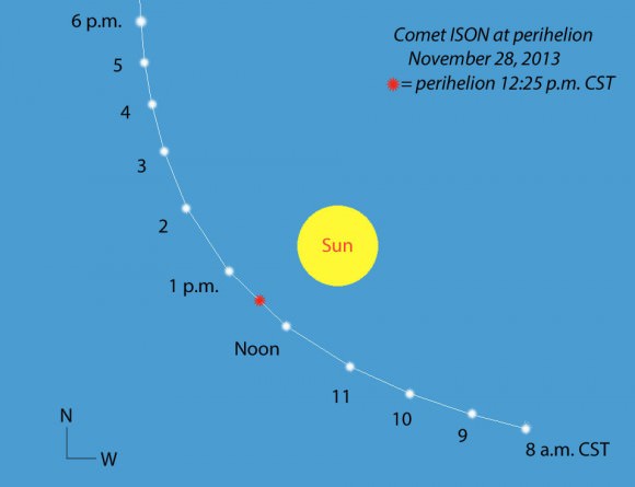 Comet ISON swings rapidly around the sun on perihelion day Nov. 28. Positions are shown hourly with north up and west to the right. Created with Chris Marriott's SkyMap software[/caption]