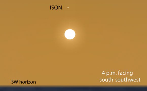 Since ISON will be 2.5 degrees from the sun in the early morning and again just before sunset, those might be the best times to find it. Compared to the hour or two around perihelion, the glare will be less though ISON will likely be a little fainter. You can use the diagram above, suitable for mid-northern latitudes, to know in what direction from the sun to look for the comet. If ISON becomes at least as bright as Venus and your sky is deep blue and haze-free, you might just see it on Thursday before sitting down to that Thanksgiving turkey dinner. But of course much depends upon the comet.