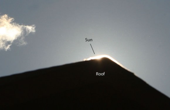 Example using a rooftop to block the sun. When using binoculars for daytime comet hunting, BE SURE you focus them first at infinity otherwise there's no way to know if the comet will be in focus. I use clouds (the best) or a distant treeline. Credit: Bob King[/caption]