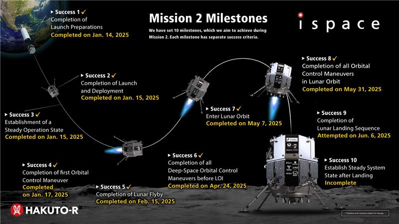 The mission was a follow-on to ispace’s Hakuto-R1 Mission One lander, which crashed over the Atlas Crater site on April 25th, 2023. The failure for that particular landing was traced to the main computer misinterpreting radar altimeter data, keeping the lander in a 5 kilometer hover above the lunar surface until engine cutoff.