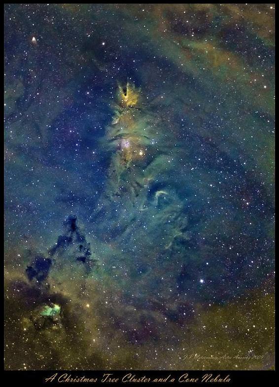 [/caption]The "Christmas Tree Cluster," was given its name by Lowell Observatory astronomer Carl Lampland. With its peak pointing due south, this triangular group is believed to be around 2600 light-years away and spans about 20 light-years. Look closely at its brightest star – S Monocerotis is not only a variable, but also has an 8th magnitude companion. The group itself is believed to be almost 2 million years old. The nebulosity is beyond the reach of a small telescope, but the brightest portion illuminated by one of its stars is the home of the Cone Nebula. Larger telescopes can see a visible V-like thread of nebulosity in this area which completes the outer edge of the dark cone. To the north is a photographic only region known as the Foxfur Nebula, part of a vast complex of nebulae that extends from Gemini to Orion.
