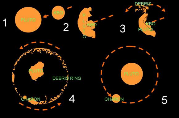 This shows how Pluto's moon Charon was created. 1: a Kuiper belt object approaches Pluto; 2: it impacts Pluto; 3: a dust ring forms around Pluto; 4: the debris aggregates to form Charon; 5: Pluto and Charon relax into spherical bodies. It's thought that the same collision created Pluto's other Moons as well. Image: Acom, Public Domain.[/caption]