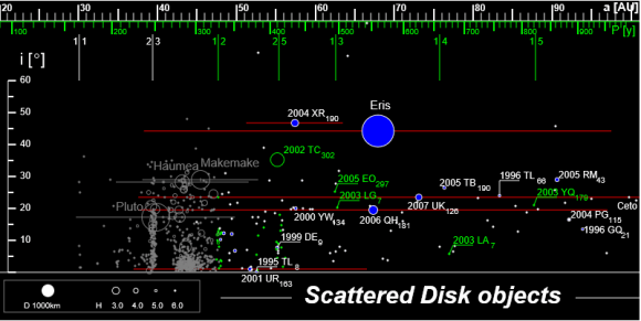 The semi-major axes and inclinations of all known scattered-disc objects (in blue) up to 100 AU together with Kuiper-belt objects (in grey) and resonant objects (in green). The eccentricity of the orbits is represented by segments (extending from the perihelion to the aphelion) with the inclination represented on Y axis. Image: EuroCommuter http://creativecommons.org/licenses/by-sa/3.0/[/caption]