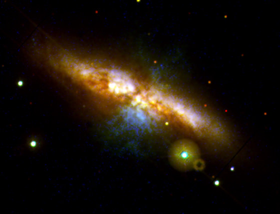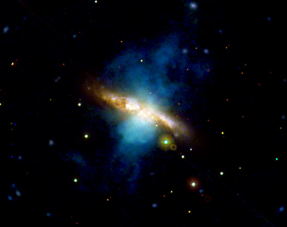 This first image shows bright knots in the plane of the galaxy, indicating a region of intense star formation, and emerging plumes of supergalactic winds glowing in X-rays.