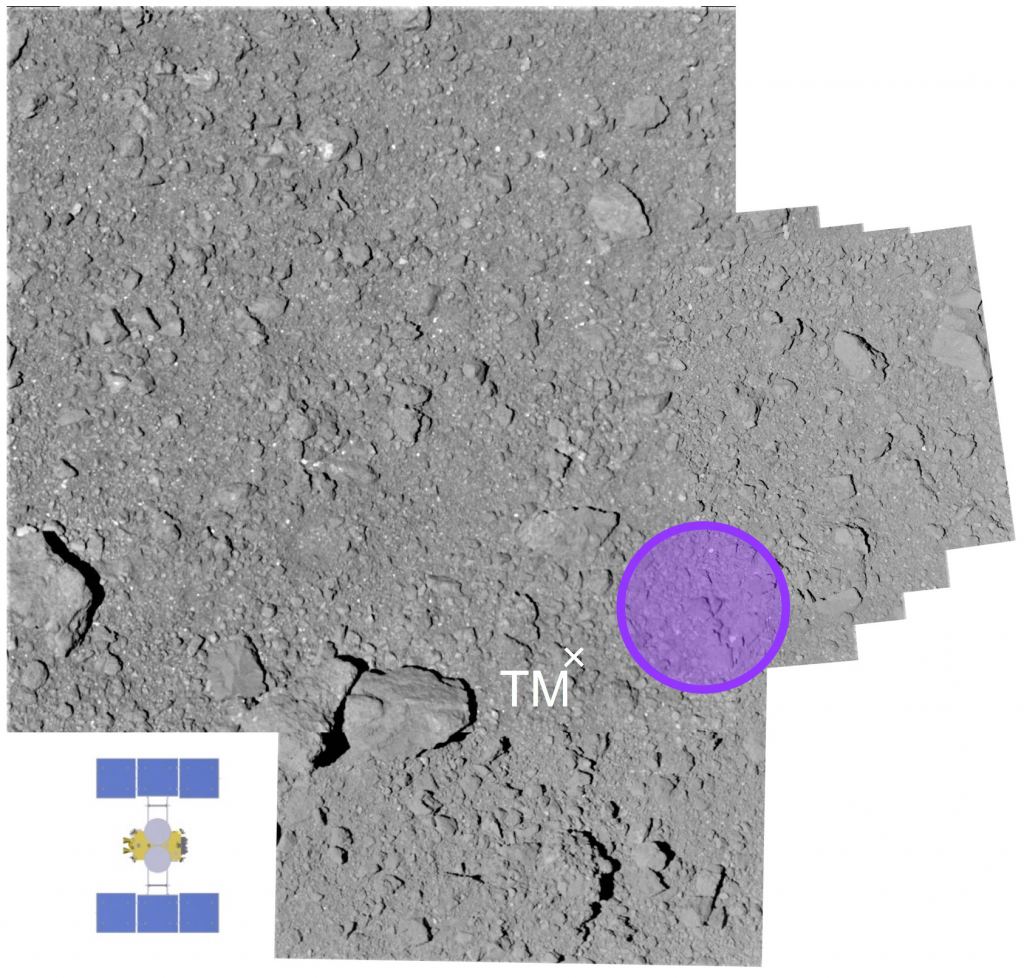 After taking off again, Hayabusa2 acquired an image of the touchdown spot using its Optical Navigation Camera – Wide angle (ONC-W1). From this image - which was taken a minute after the spacecraft had reached an altitude of 25 km (15.5 mi) - the mission team saw that the landing spot was suddenly darker than its surroundings.