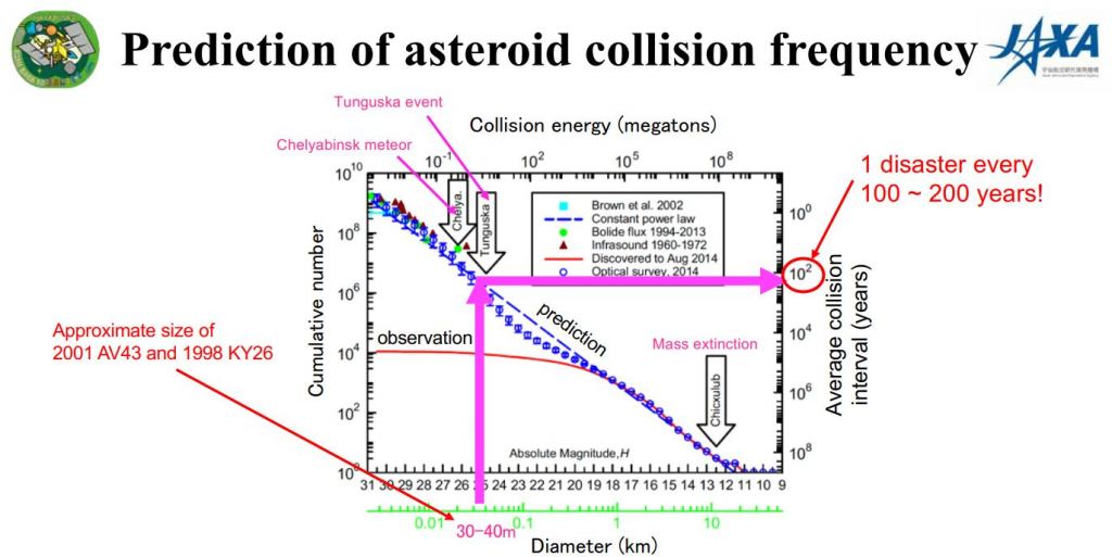 "If a celestial body with a diameter of several tens of meters collides with the Earth, great damage is expected to occur locally," JAXA says in their press release. They then point out that the Chelyabinsk meteor was only about 17m in diameter, and it injured about 1500 people when it exploded in the air. "However," the press release says, "the mechanical properties such as the strength of micro-asteroids, the rotation state and physical properties are not well understood." The visit to 1998 KY26 will hopefully give us some important knowledge.