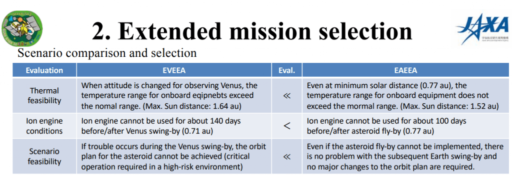 The rejected route would've limited the use of the spacecraft's ion engines, too. The flyby of Venus would've meant a 140 day period where the engines can't be used because of the higher temperature that close to the Sun. But the selected Earth flyby mission cuts that down' to only 100 days. Also, if the Venus flyby didn't work for some reason, then Hayabusa2 would not be able to enter its intended orbit around 1998 KY26 in 2031.