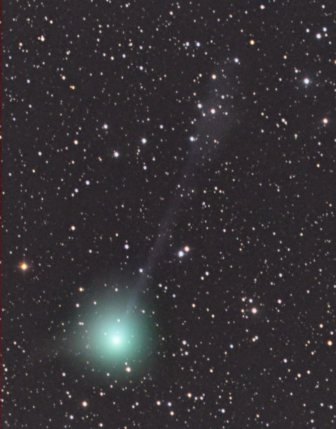 Through a telescope, Lovejoy still shows off a round, 6 arc minute diameter coma (one-fifth as wide as a full moon) and a denser, brighter core highlighted by a starlike false nucleus. We call it