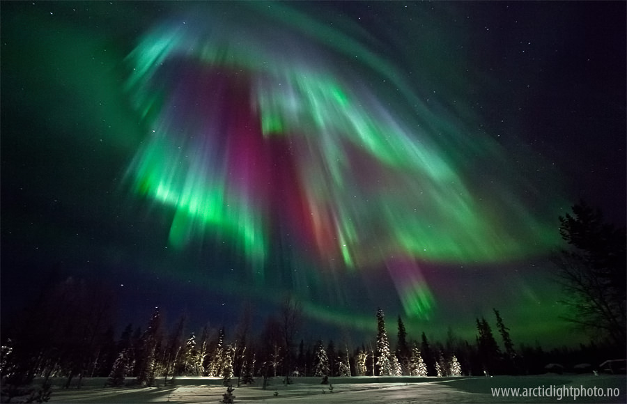 "Shot at the end of a 'weak' aurora night in Muonio, Finland. Took this at outside the cabin I was staying at close to Harriniva. The outburst came from an CME that first started disappointingly weak. I was about to go to bed but thought I should wait just a little more and see. Man am I glad I waited!!"