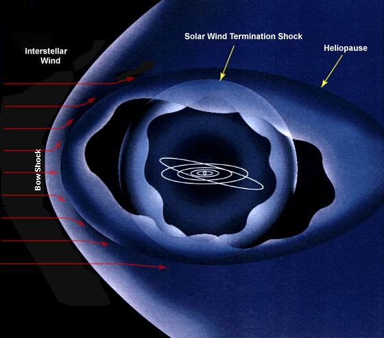 There are several different parts of the heliosphere. The heliopause is the boundary between the heliosphere and the LISM. When solar winds approach this blurred region, they slow abruptly causing a shock wave to form known as the solar wind termination shock. The action is similar to slamming down on the brakes in a car, causing people and objects in the car to fly forward. This shock wave actually causes the particles to accelerate, aiding in the formation of the heliosphere. After it has slowed down, the winds of interstellar space act on the solar winds causing them to curve forming what has been described as a comet-like tail to the Sun. This tail, which has been examined by NASA's probes Voyager 1 and Voyager2, is called the heliosheath. The termination shock is from around 75 to 90 astronomical units (AU) from our Sun, and at its closest point, the heliosheath is approximately 80 to 100 AU from the Sun.