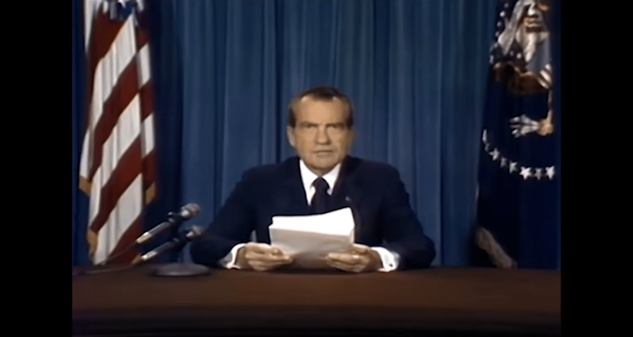 Nixon sits in front of the cameras in the White House, and reads his speech. "Good evening, my fellow Americans. Fate has ordained that the men who went to the Moon to explore in peace will stay on the Moon to rest in peace."