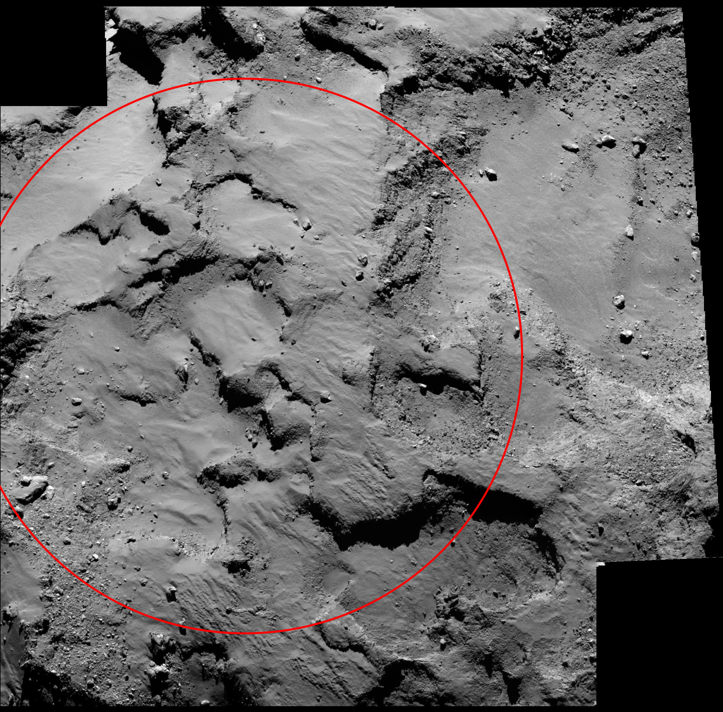 The long-awaited deployment of the Philae lander, currently "piggybacked" aboard ESA's Rosetta spacecraft orbiting the nucleus of Comet 67P/Churyumov-Gerasimenko, will occur in less than a month and we now have our best look yet at the area now green-lighted for touchdown. The picture above, made from two images acquired by Rosetta's OSIRIS imaging instrument, shows a 500-meter circle centered on "Site J," a spot on the comet's "head" carefully
